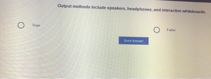 True False Save Answer Output methods include speakers headphones and interactive. An output device is any hardware component that conveys information to one or more people. True The Americans with Disabilities Act ADA requires that public schools purchase or acquire funding.